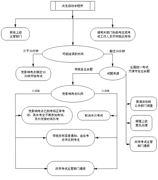当考点有多数考生或考试工作人员因交通、气象灾害等不可抗拒的意外原因迟到时,启动本程序。