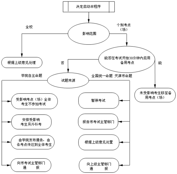 当考试开始前发生地震、公共卫生等全市性事件,或个别考点(场)发生火灾、暴力犯罪、影响公共安全的群体性事件时,启动本程序。