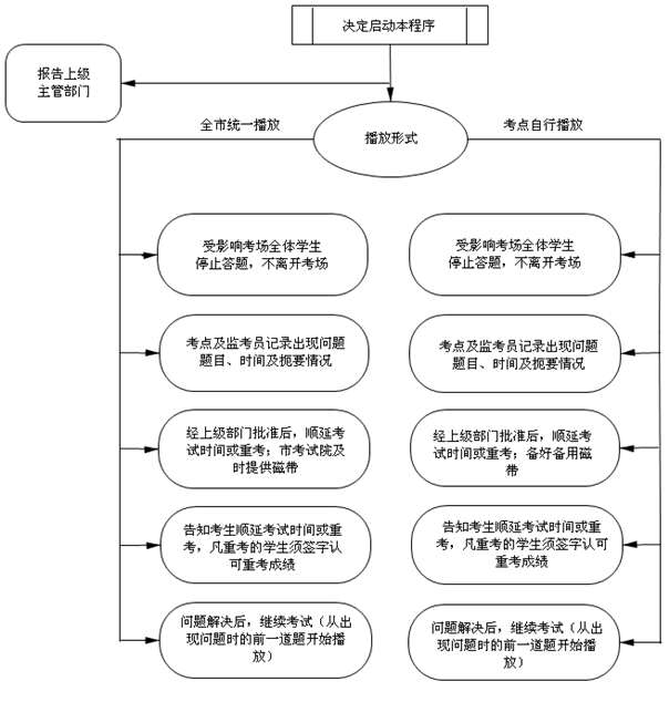 当外语听力考试进行中发生停电、磁带不清、异常天气、播放设备故障等影响考试进行的事件时,启动本程序。